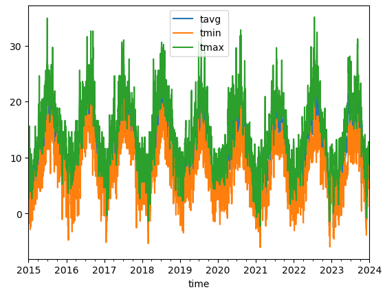 data.plot(y=['tavg', 'tmin', 'tmax'])
