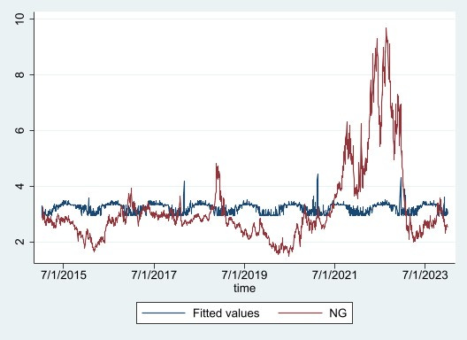 After running this regression model we get an R-squared value of 0.0147 meaning we can only explain 1.47% of the variation in natural gas prices over the 9-year period with this regression model.